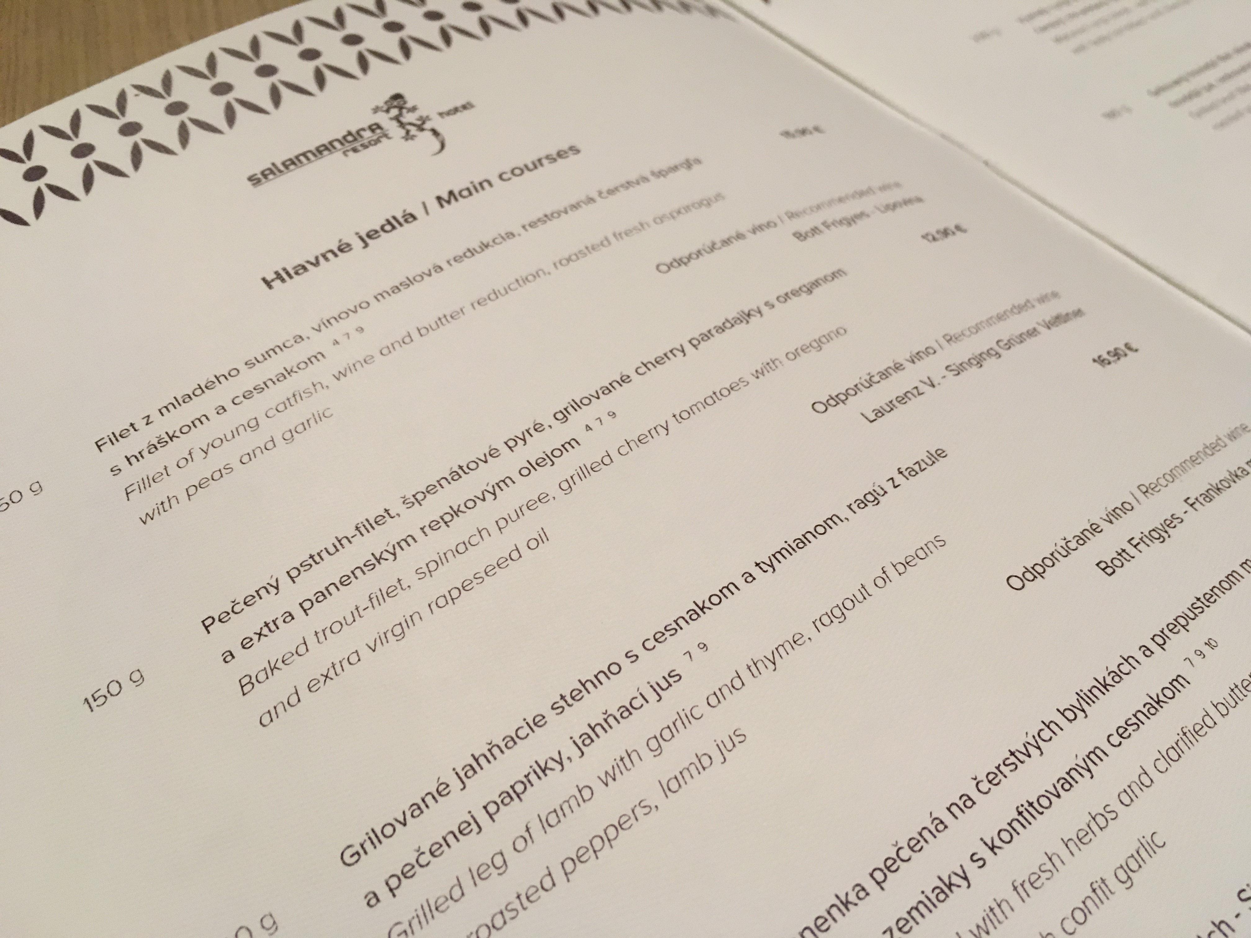 V Salamandre to však je o niečom inom a gastronómiu radia k jednému z hlavných ťahákov. Nedávno prepracovali stratégiu a snažia sa orientovať na lokálne suroviny, kde som ocenil najmä výber diviny, jahňaciny, či slovenských vín. Lístok bol vkusný, prehľadný a páčilo sa mi aj odporúčanie vybraného najvhodnejšieho vína k danému jedlu.